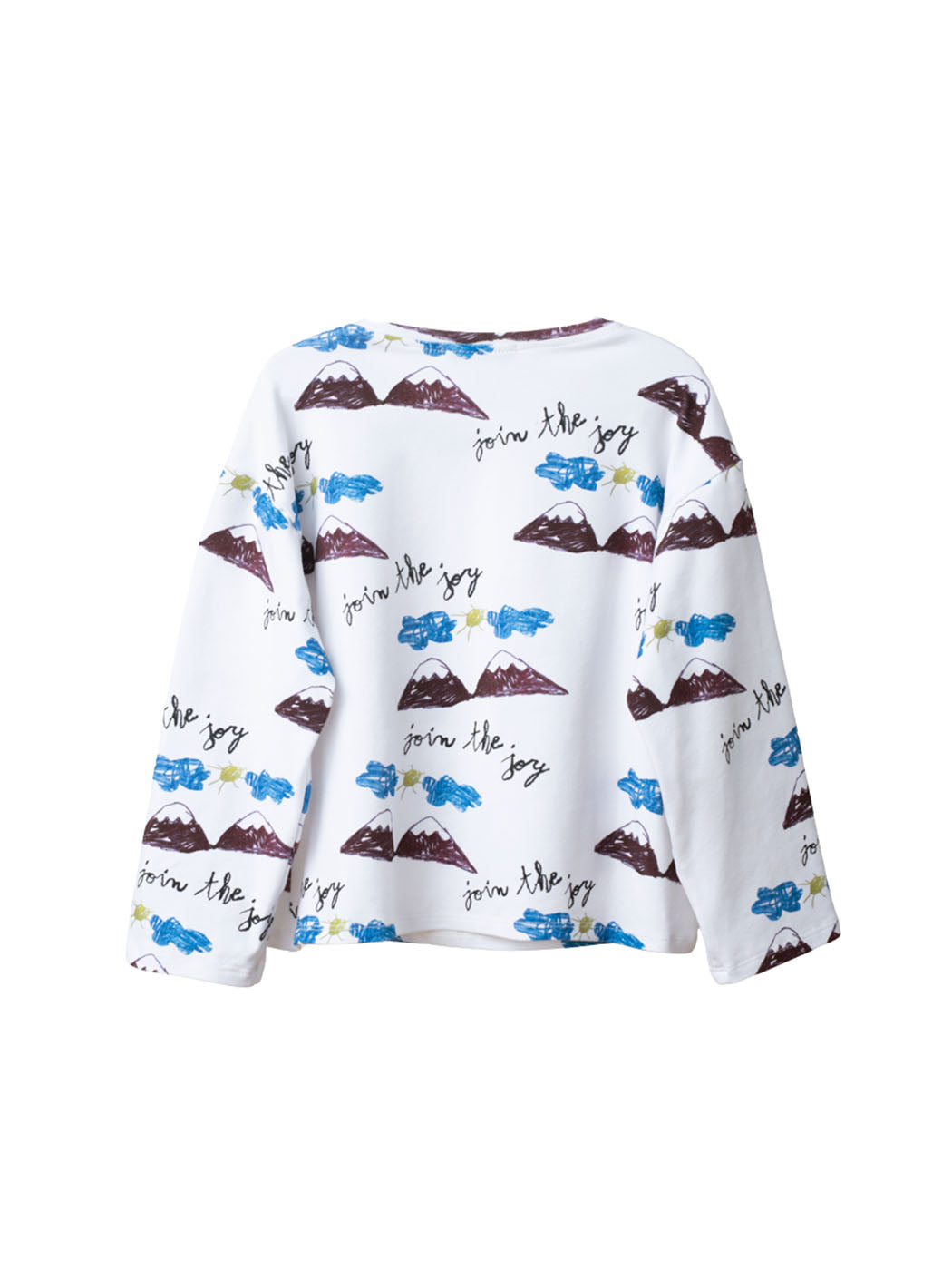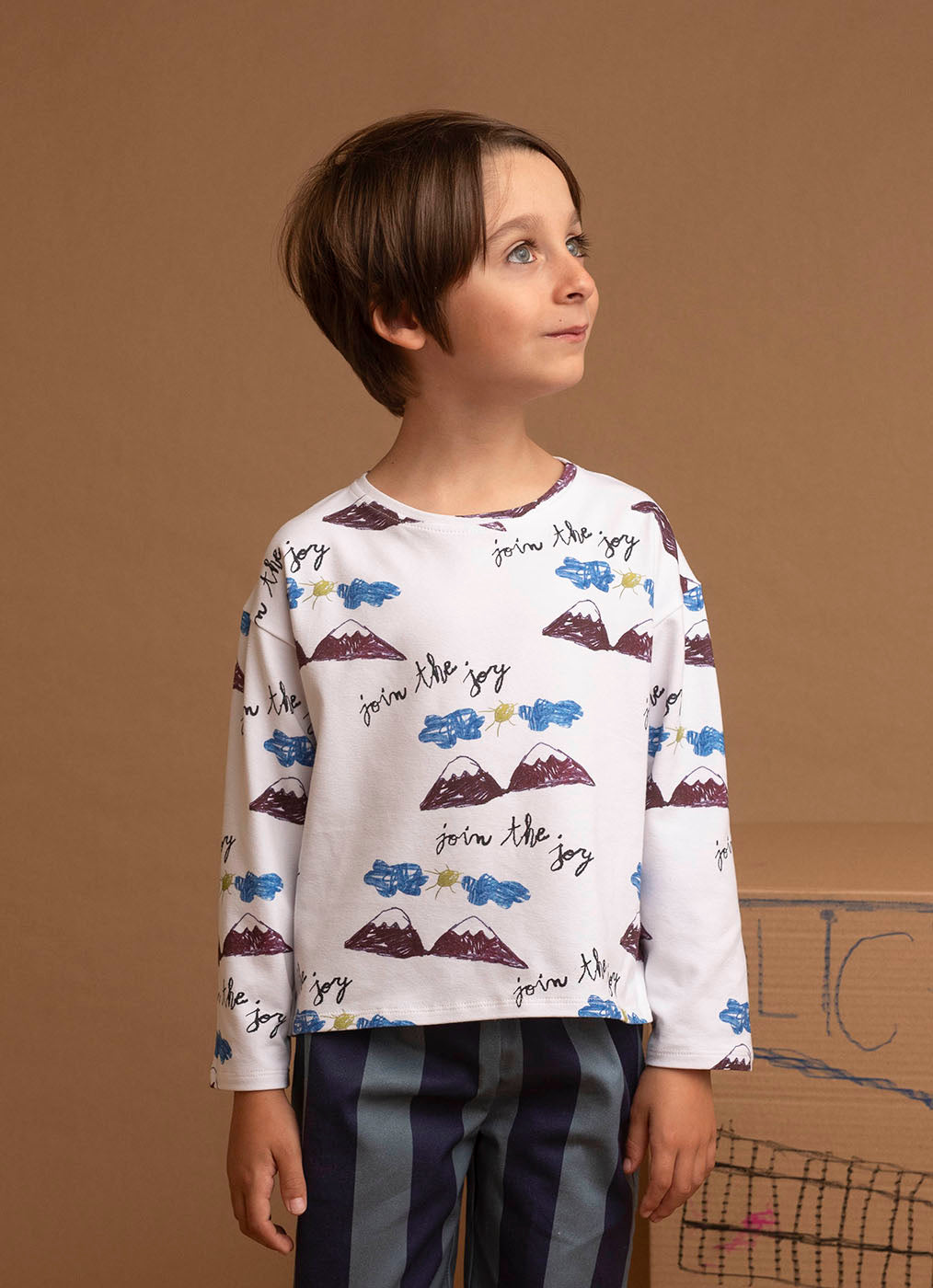 Camiseta blanca de manga larga con montañas y el lema Join the Joy que combina diseño inspirador y sostenibilidad. Confeccionada en el mejor algodón orgánico con certificado GOTS, es un básico lleno de carácter para los peques.