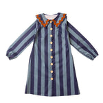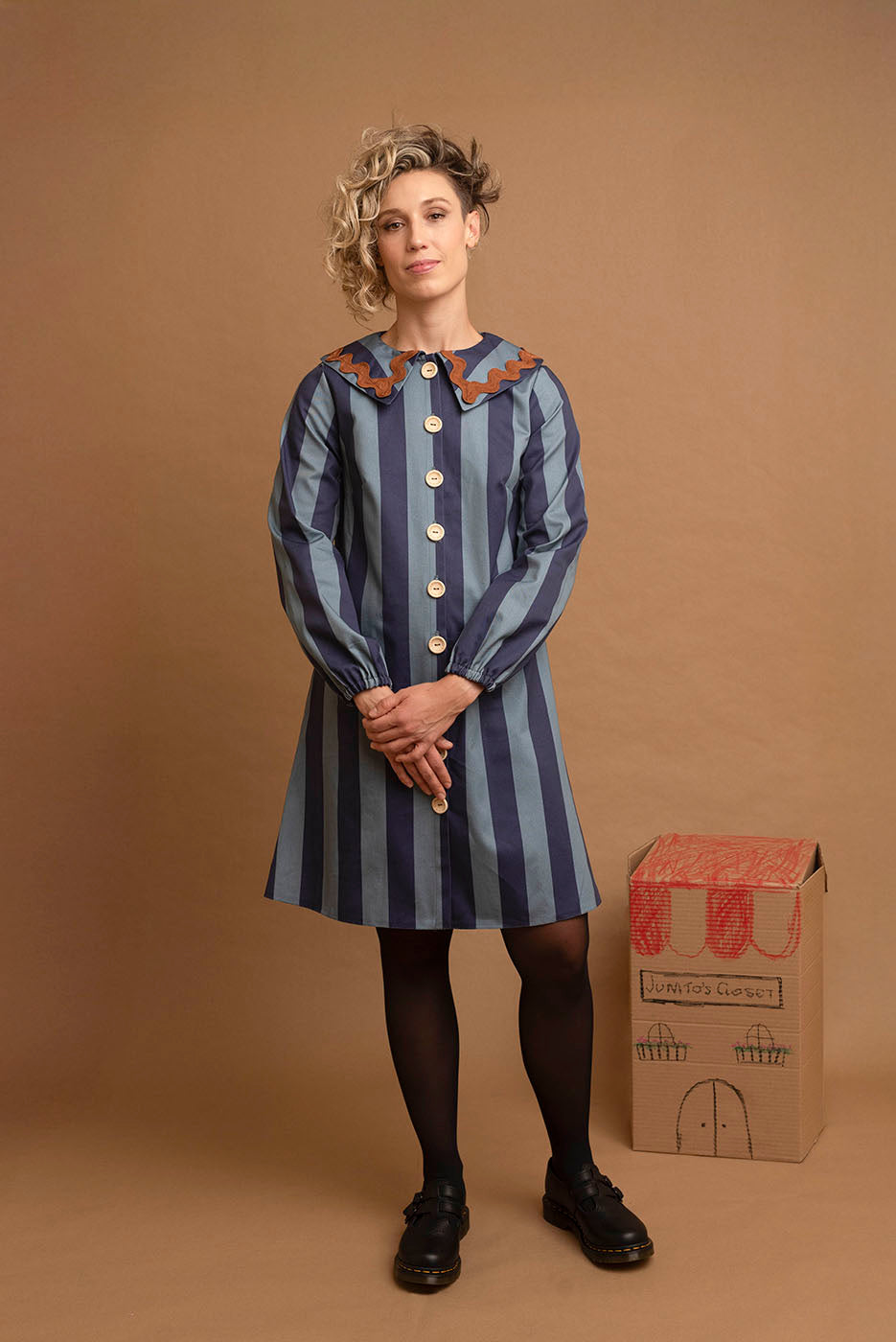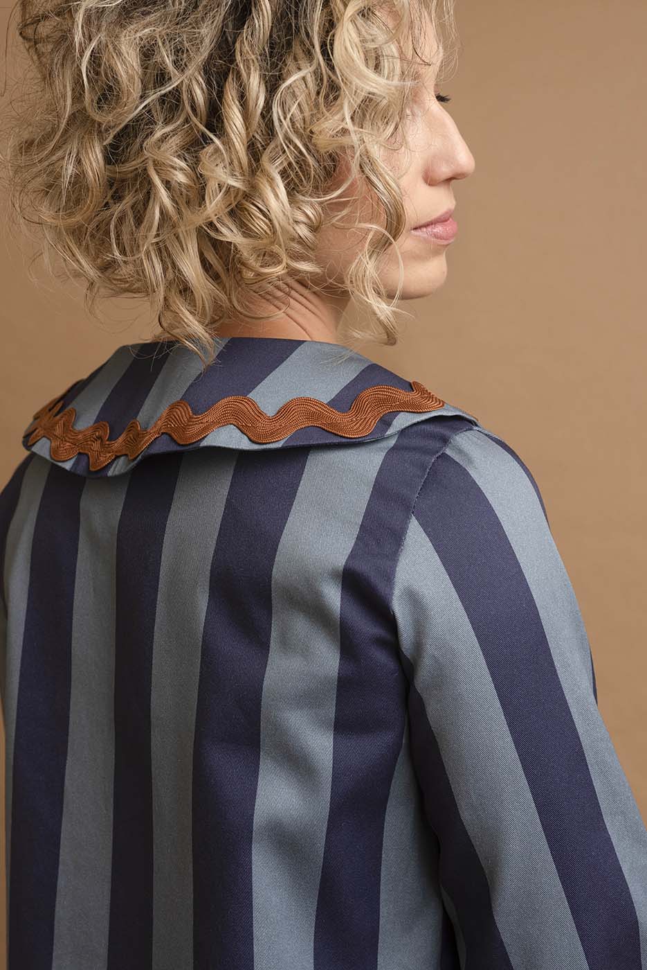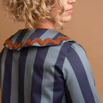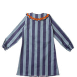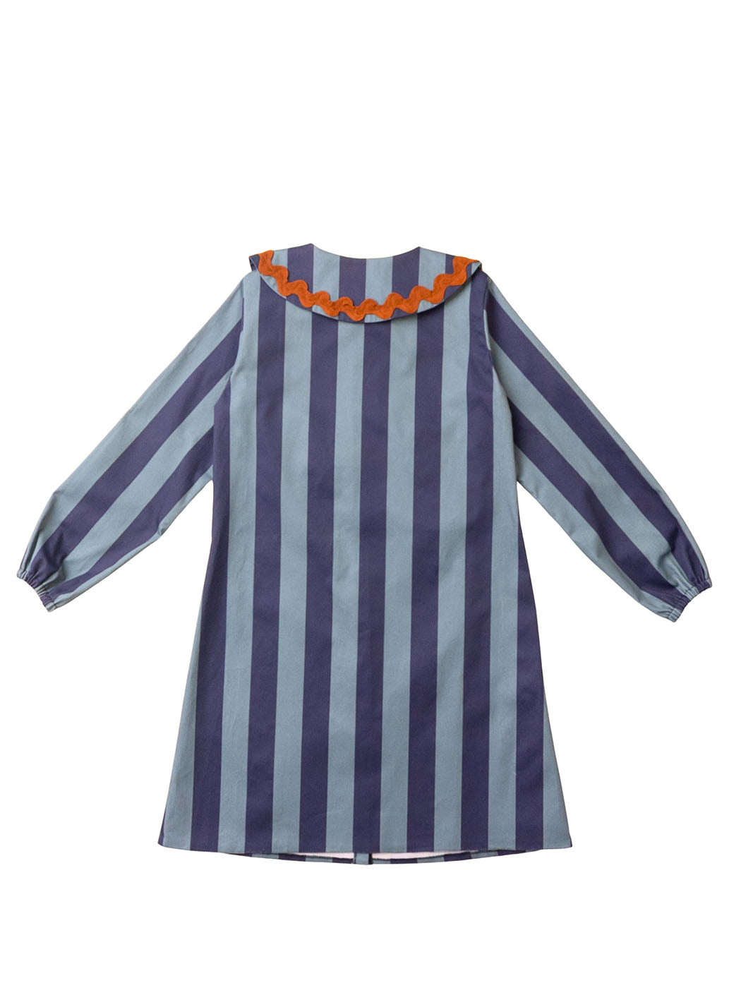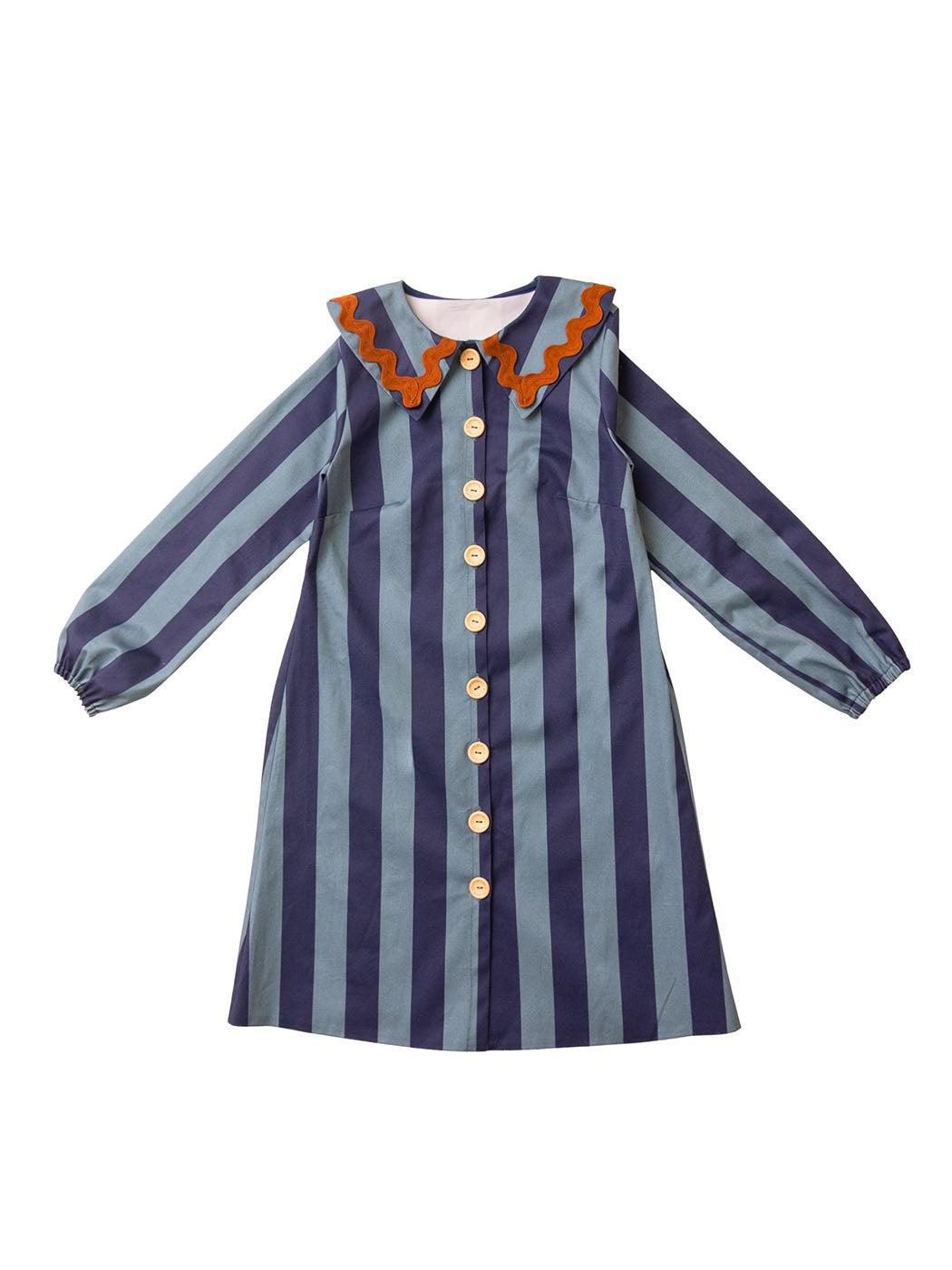 Este vestido camisero de rayas anchas azules con cuello y manga larga abullonada es perfecto para un look cómodo y versátil para cada ocasión. Hecho en algodón orgánico GOTS, es divertido y atemporal.