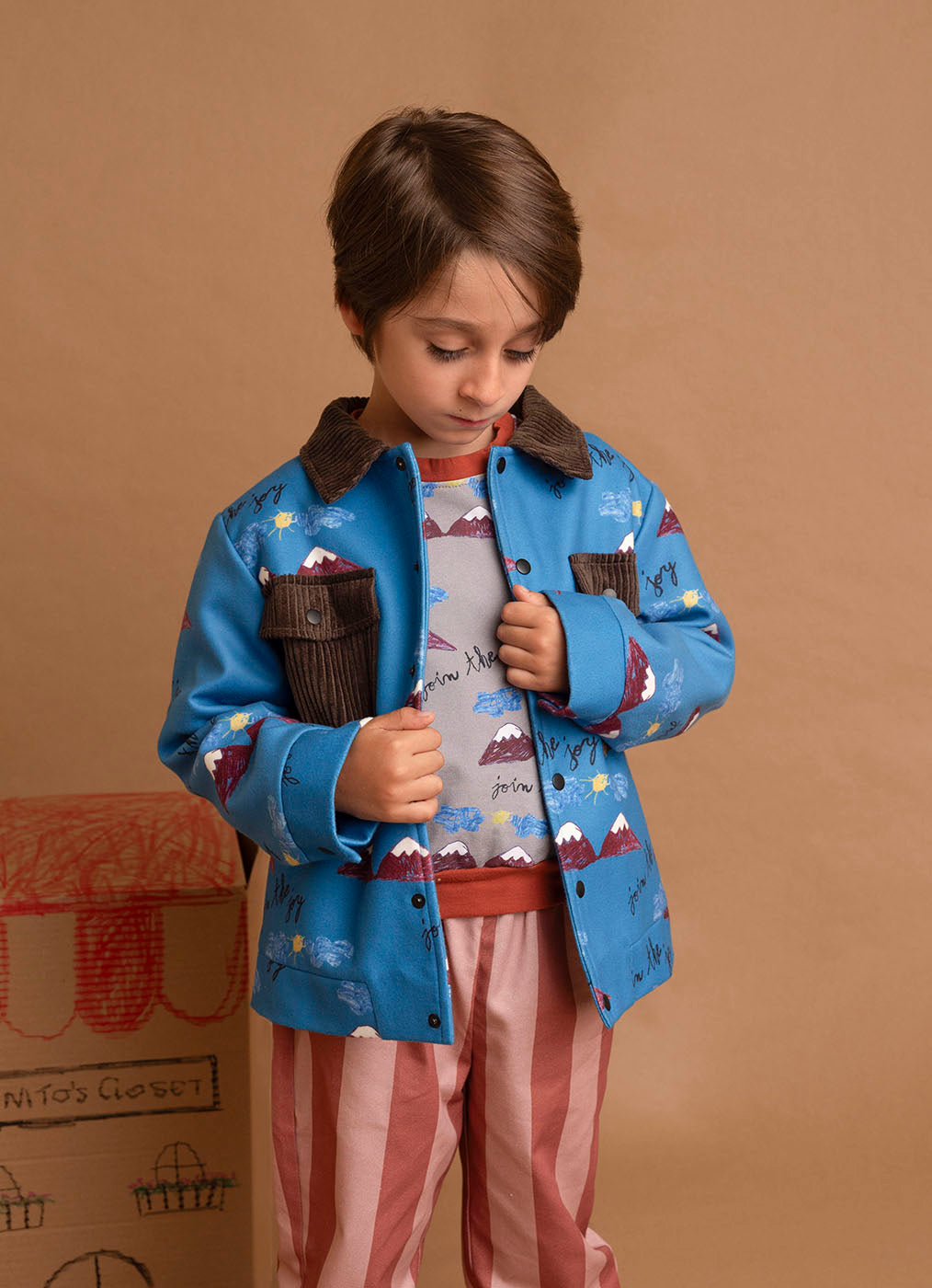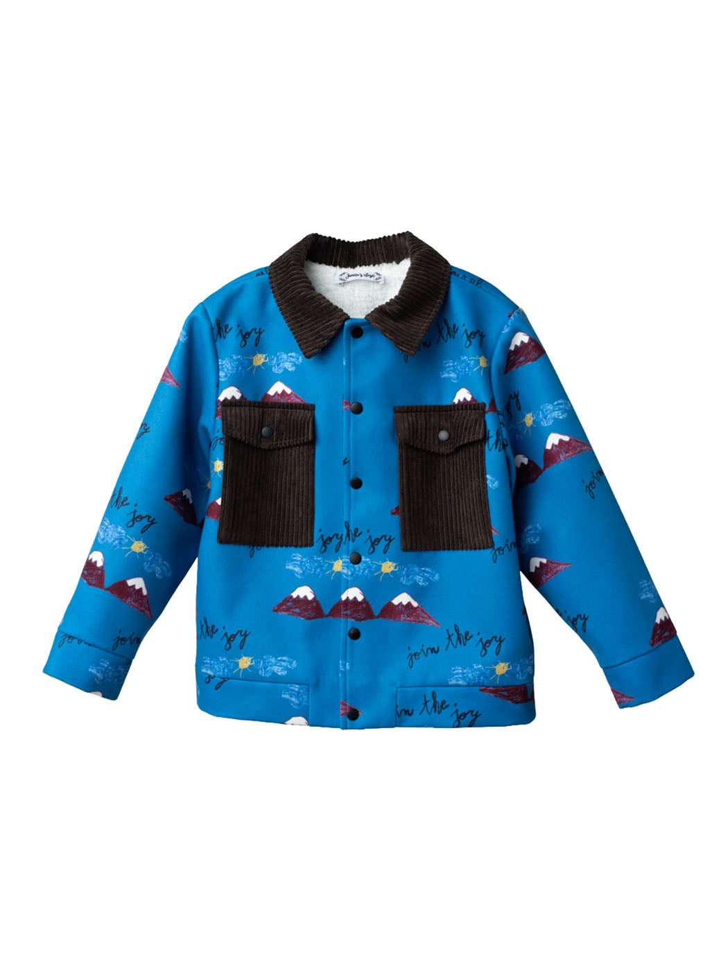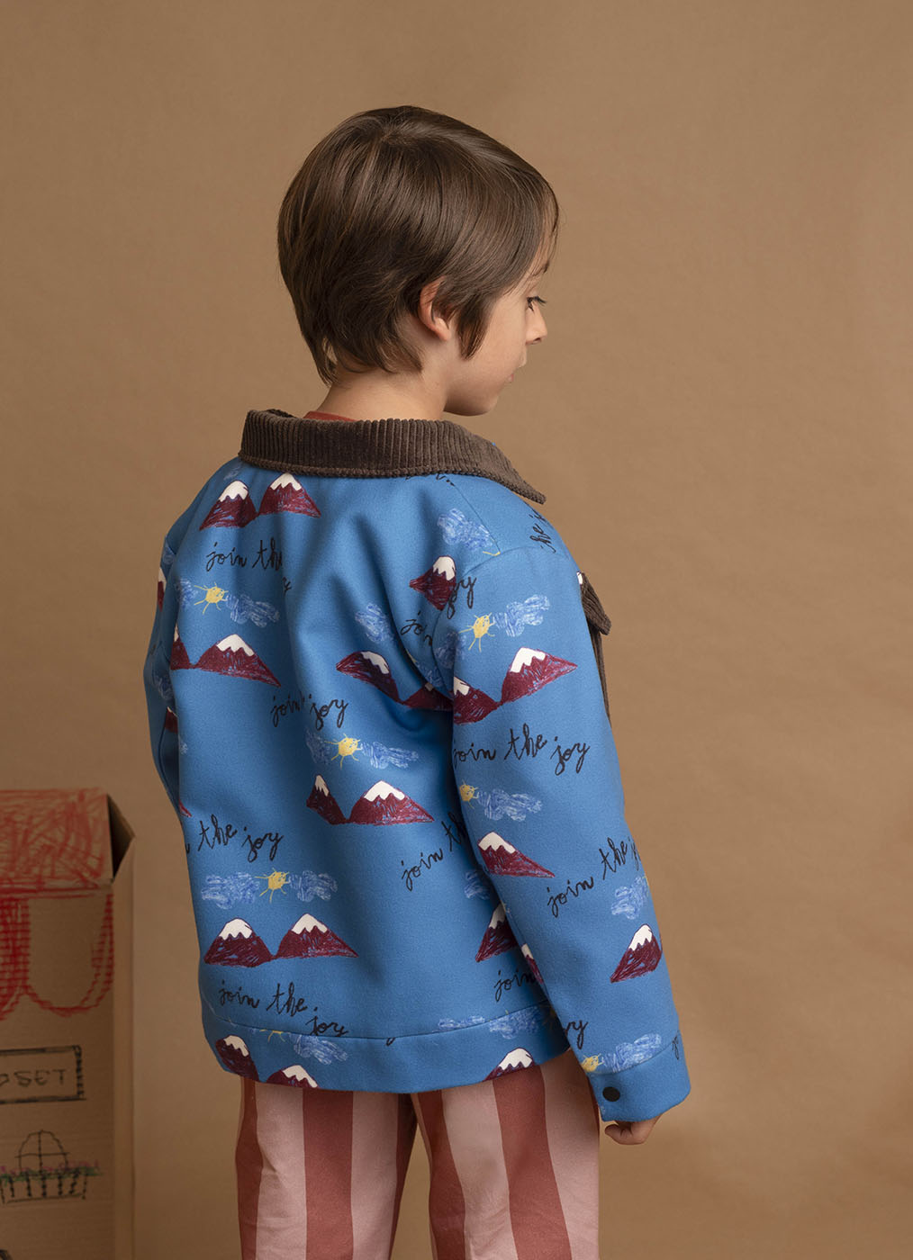 Our blue worker jacket with mountains and the Join the Joy slogan is a versatile piece that adds personality to any look. A durable and creative piece you'll wear every day.