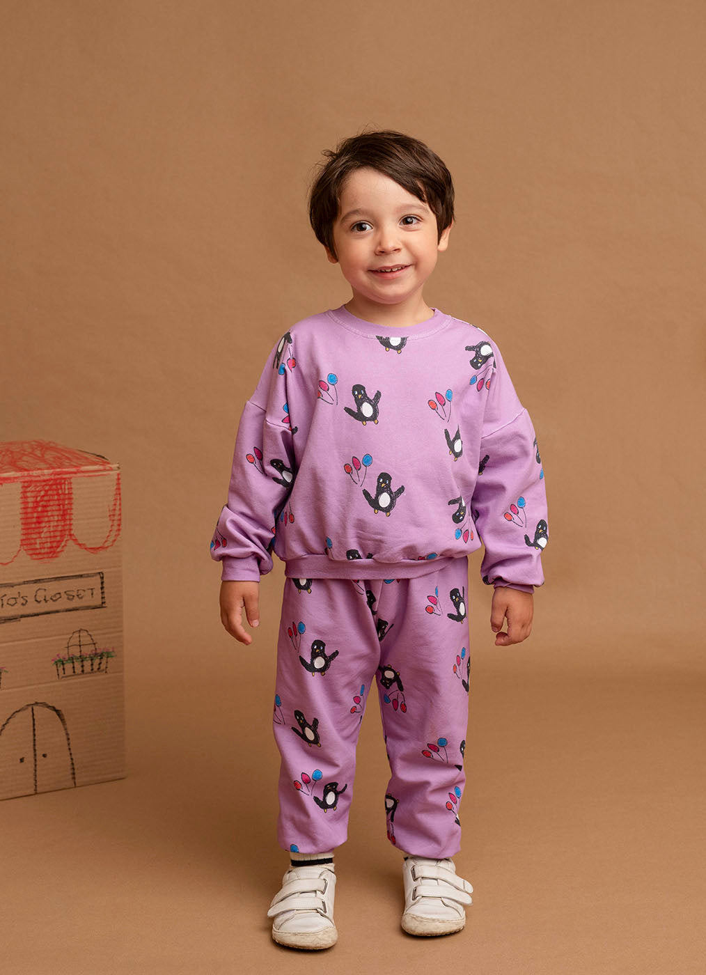 Este chándal en color morado con estampado de pingüinos es tan suave y cómodo como alegre, perfecto para que tu peque juegue sin límites. Hecho en algodón con certificado Oeko-Tex, es ideal para el día a día.