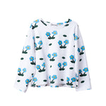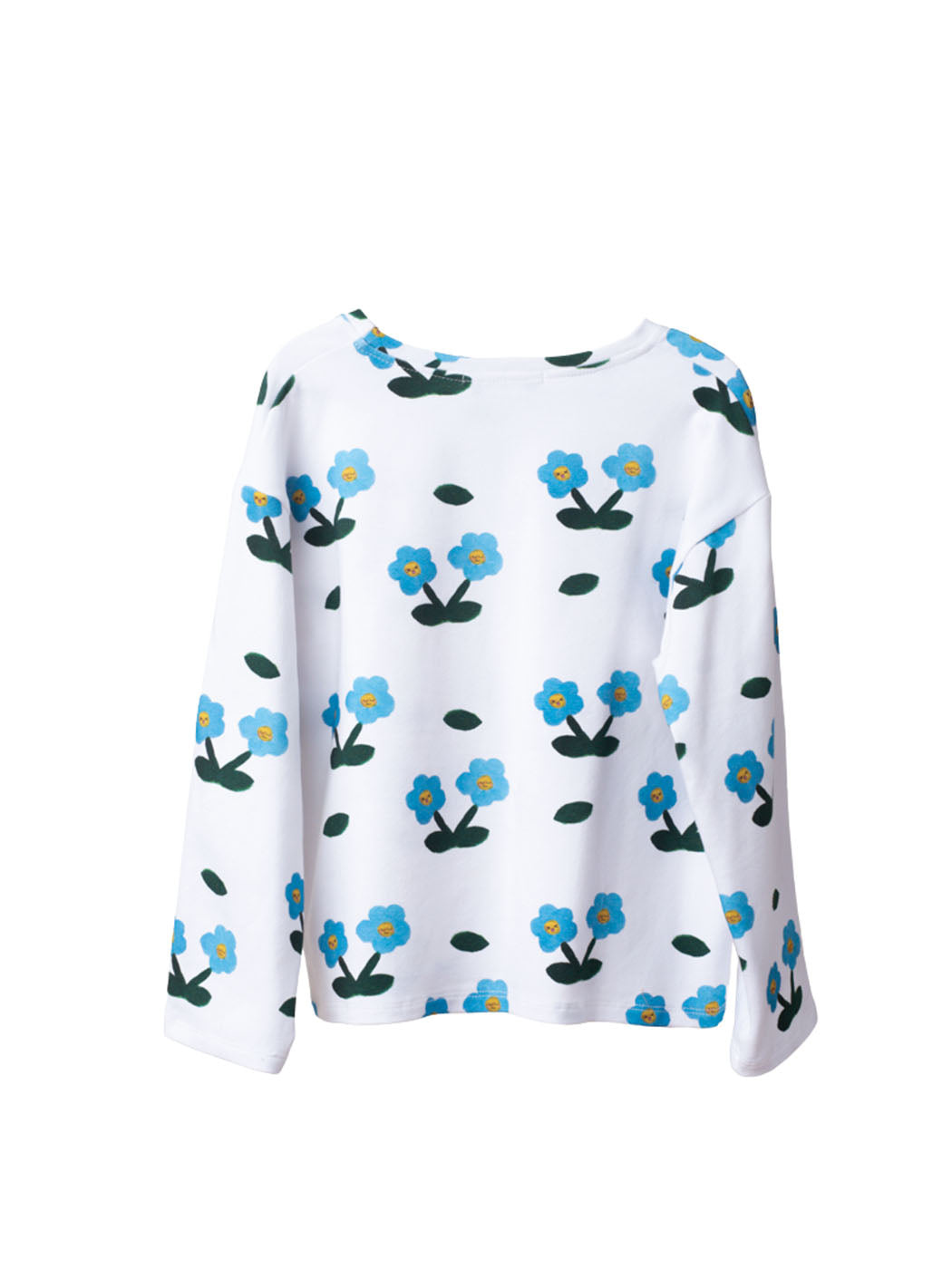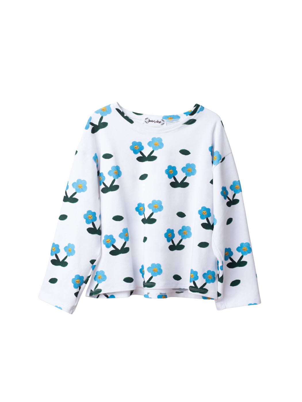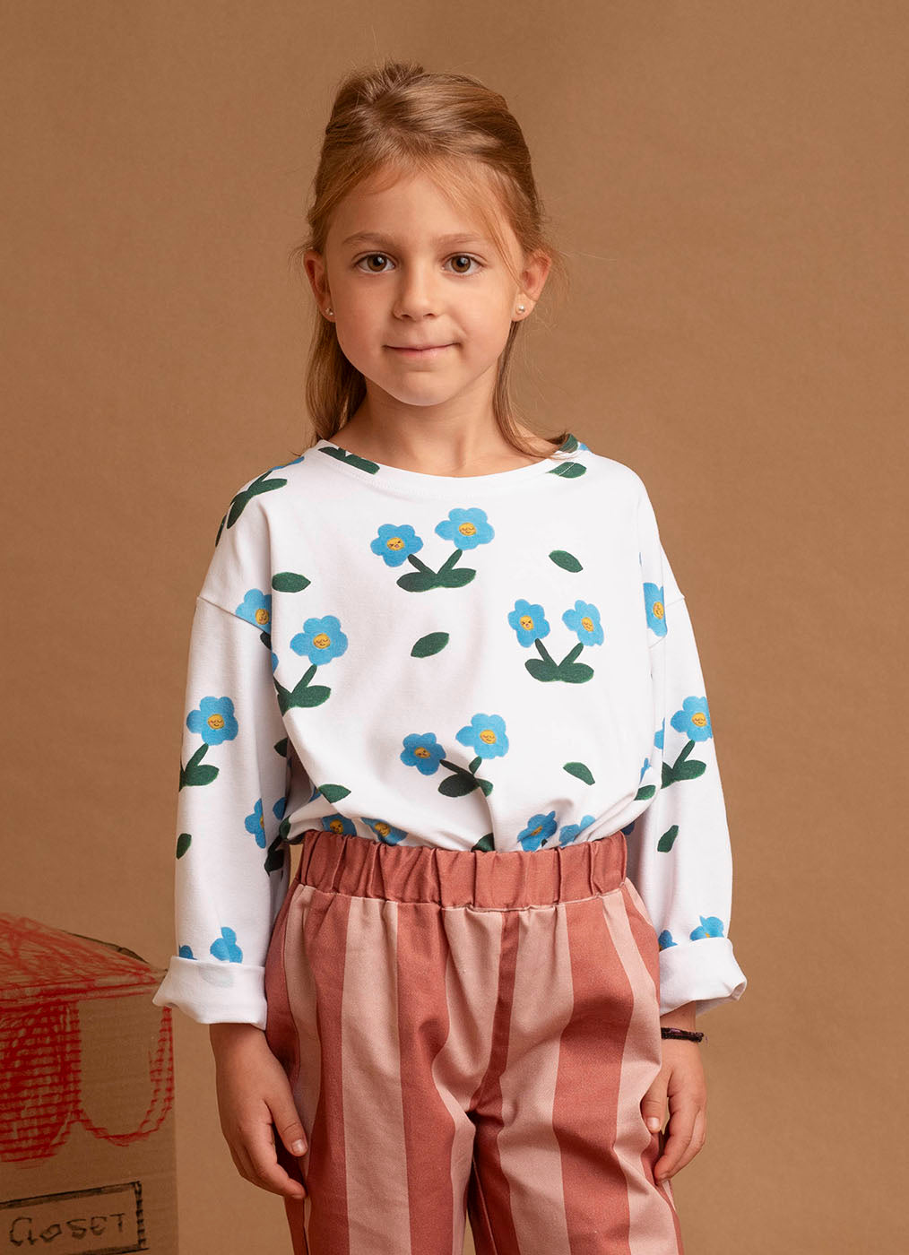 Camiseta unisex blanca, de manga larga y con una estampado de traviesas flores para nuestros peques más trastos. Realizada en suave algodón orgánico con certificado GOTS. Perfecta y resistente a cualquier peripecia.
