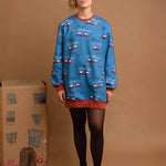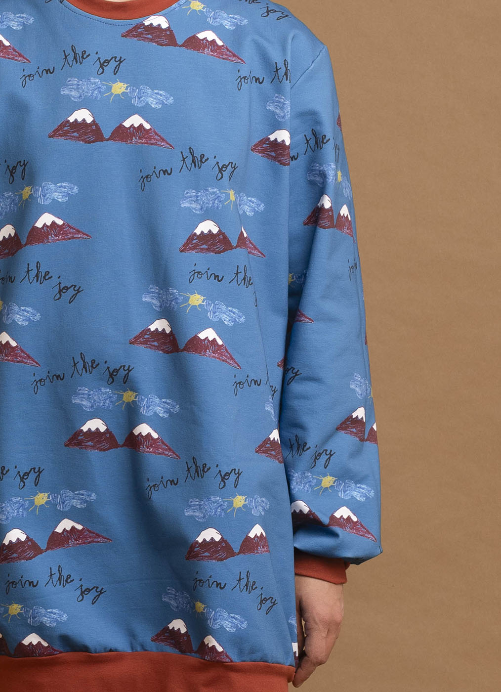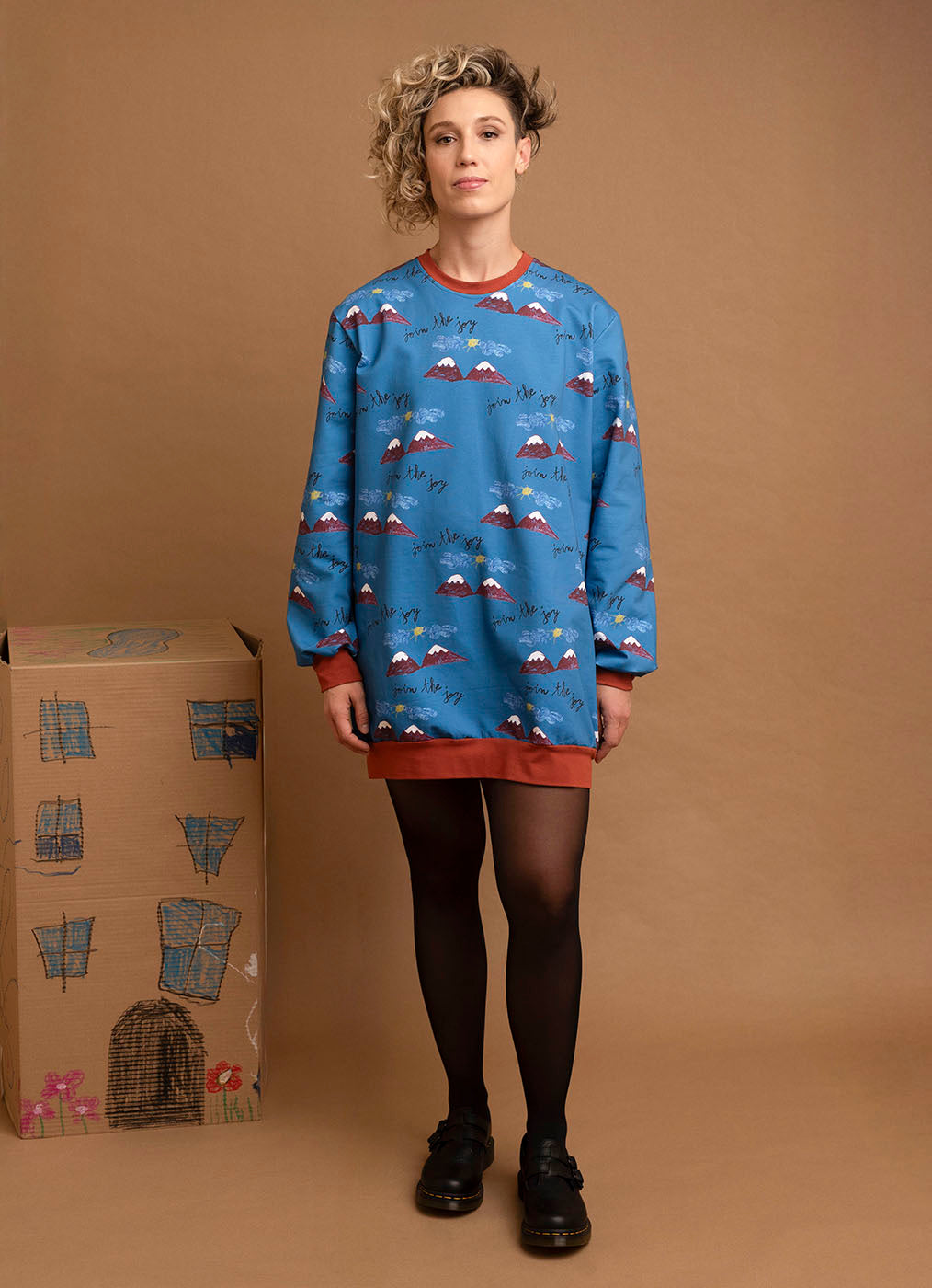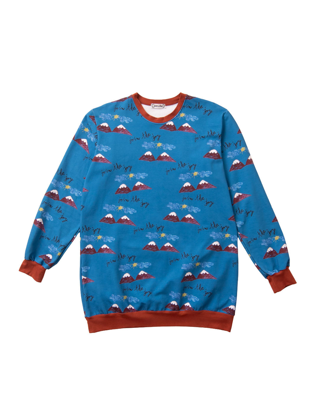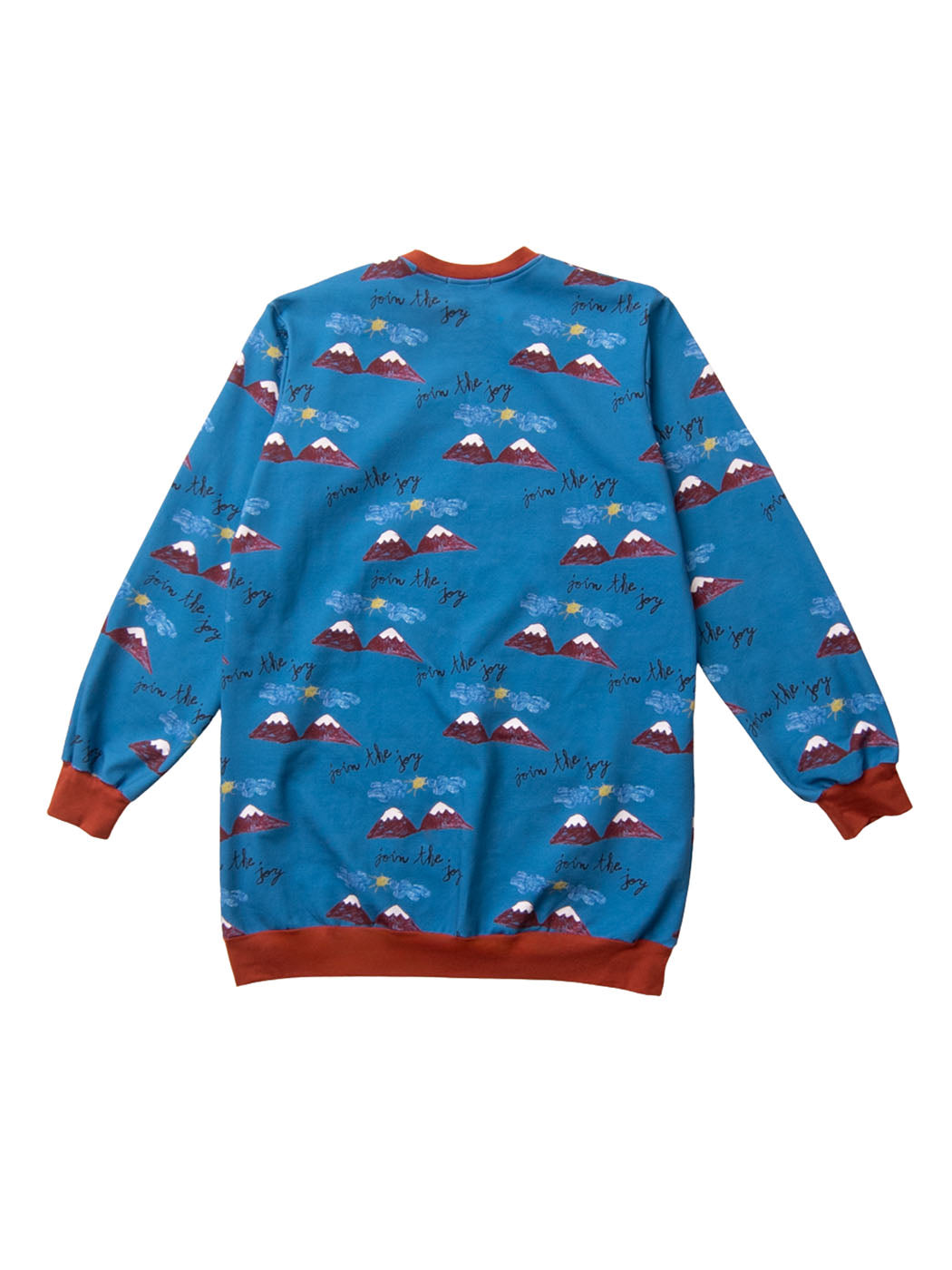 Este vestido sudadera azul con estampado de montañas y el mensaje Join the Joy es ideal para mujeres que buscan estilo y confort en la misma prenda. Hecho en algodón certificado Oeko-Tex, es perfecto para cualquier aventura.
