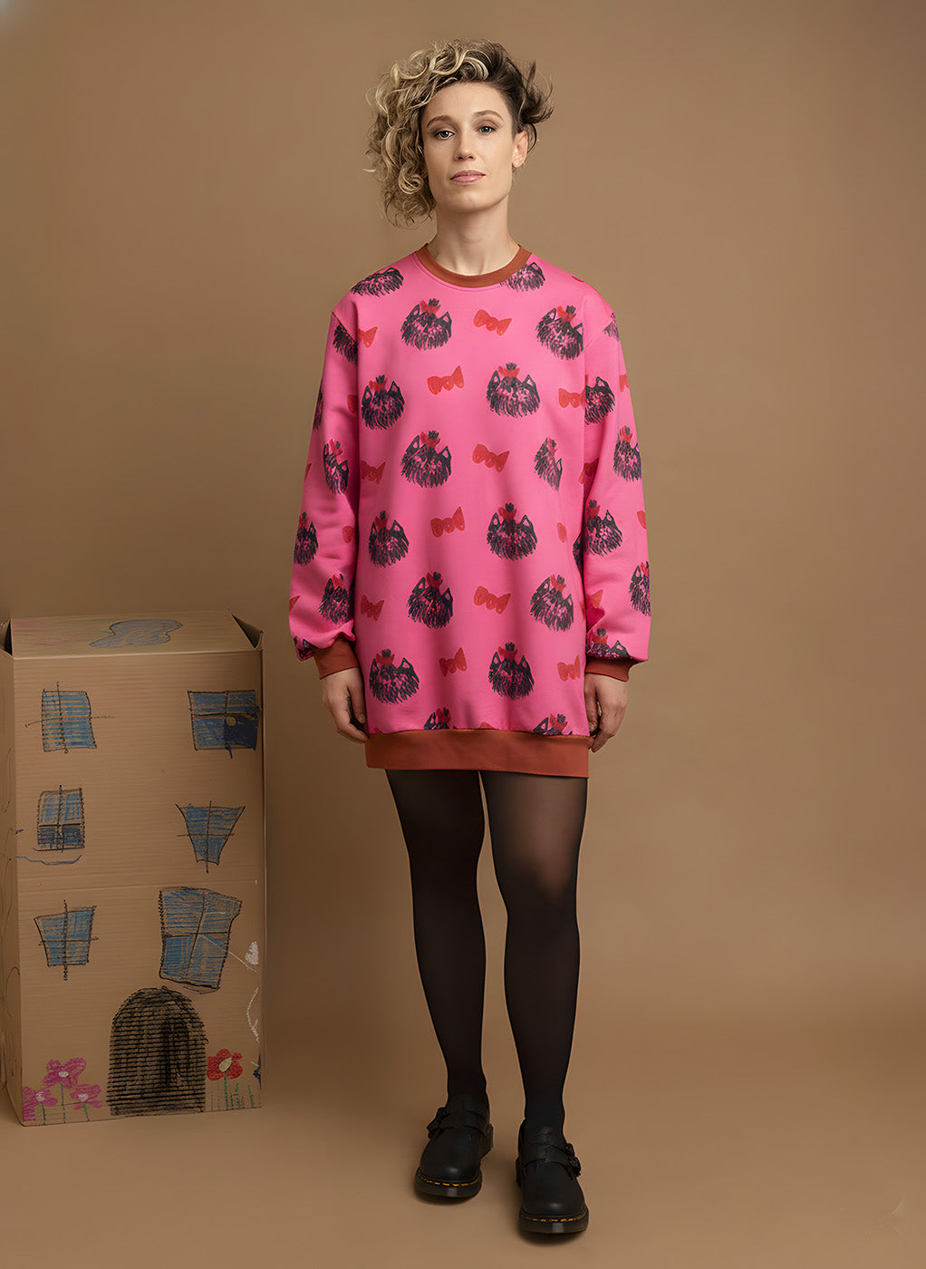 Este vestido sudadera con estampado de "Juno" es un recuerdo de la perrita de la familia. Confeccionado en algodón Oeko-tex, es perfecto para correr detras de los peques y para mujeres que buscan diferenciarse.
