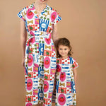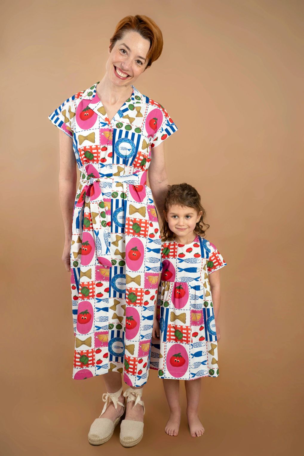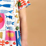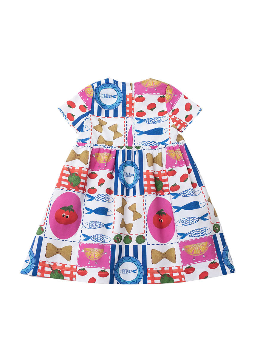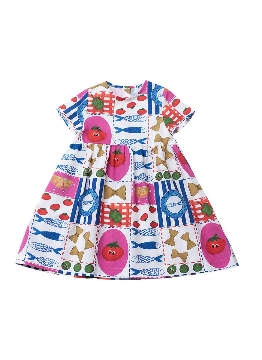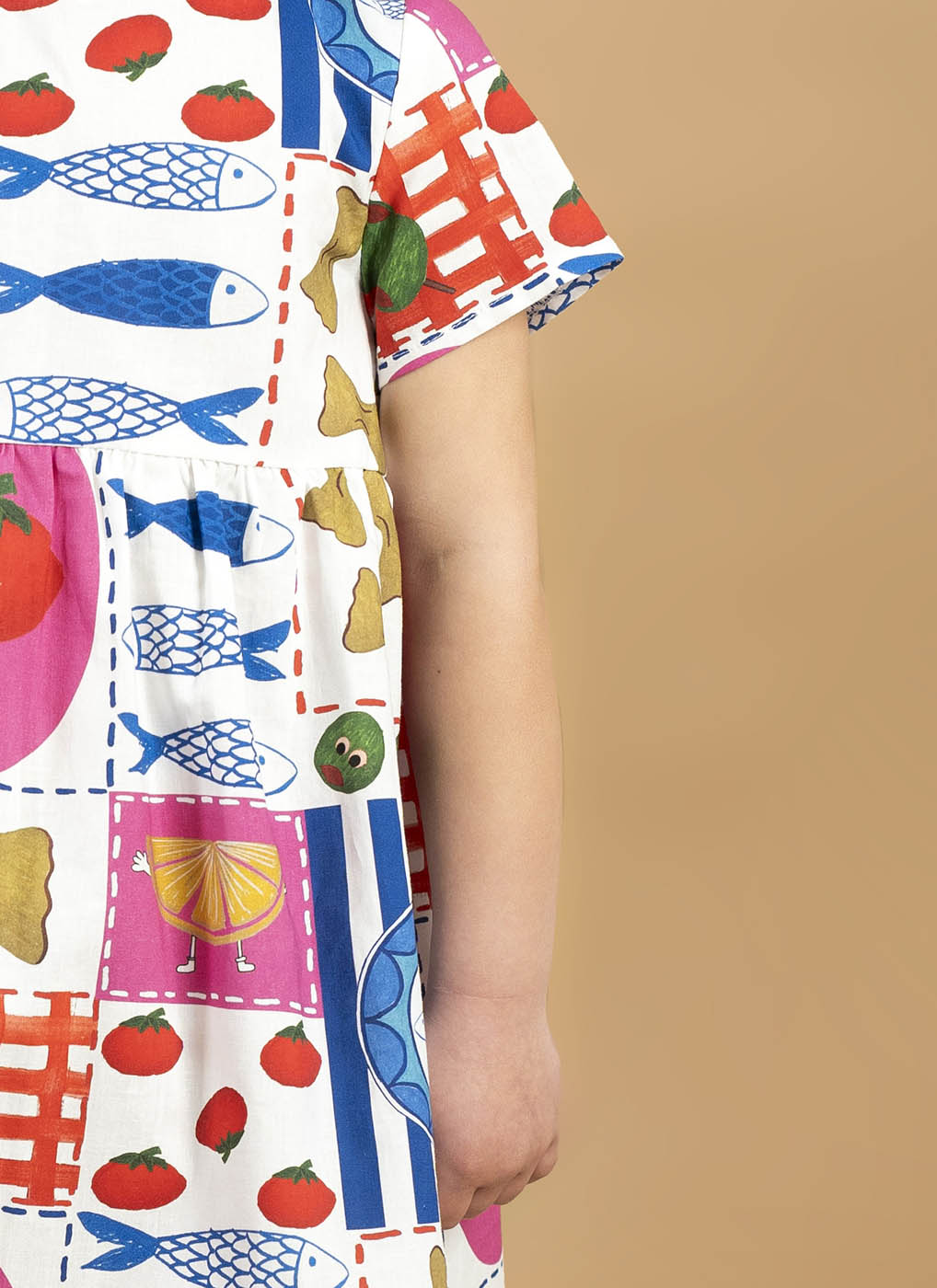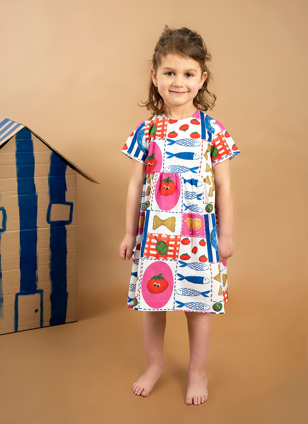 🍅 A feast of color and joy for the summer. This short-sleeve dress is a true visual party. Featuring an original and hilarious print that mixes friendly tomatoes, sardines, adventurous lemons, olives, and picnic tablecloth checks, it is the perfect garment to celebrate the warm weather. Made from soft, lightweight cotton, it combines absolute comfort with a unique, imaginative design that will spark smiles on every adventure.