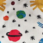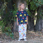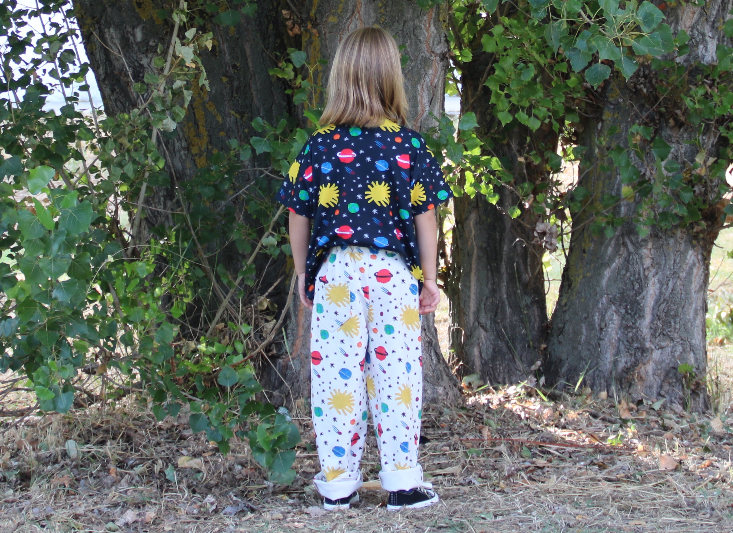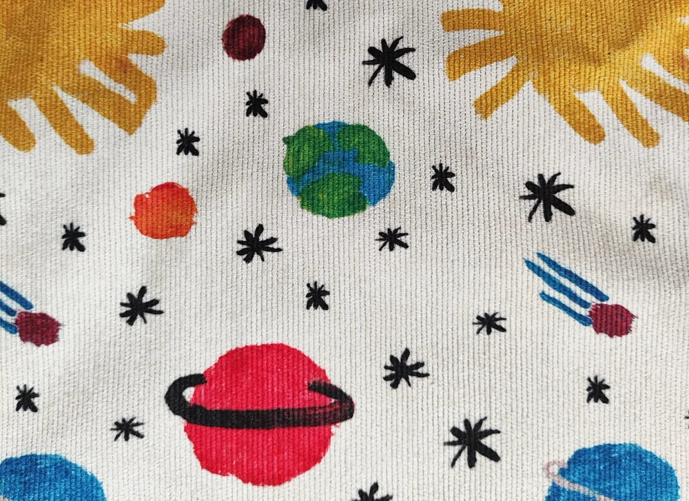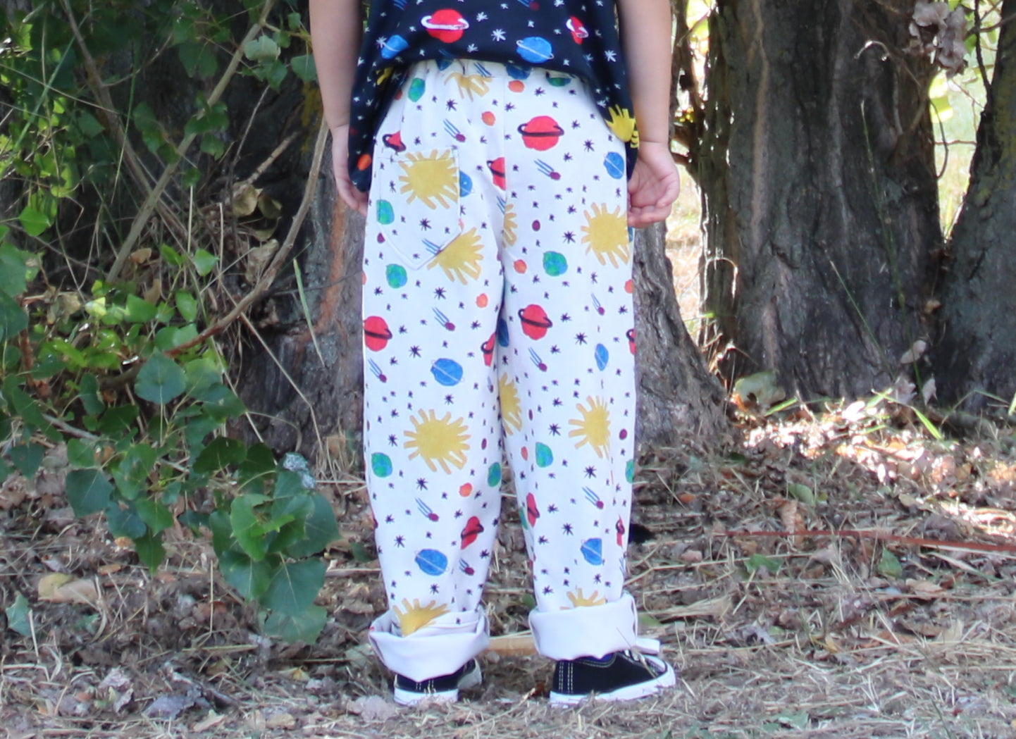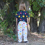 These velvety corduroy pants feature our own print. This is our original design. The designs were painted by the designer's son, and as you can see, the child's brushstrokes are visible.