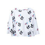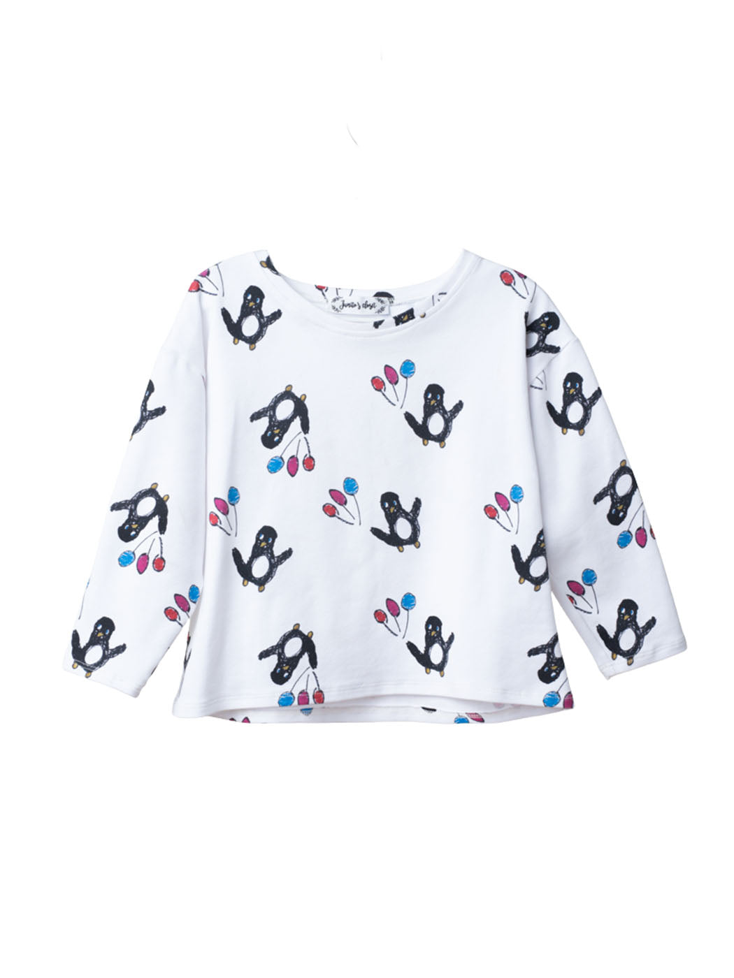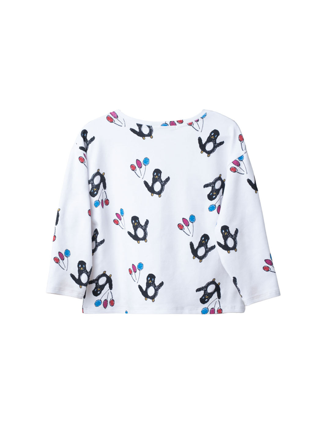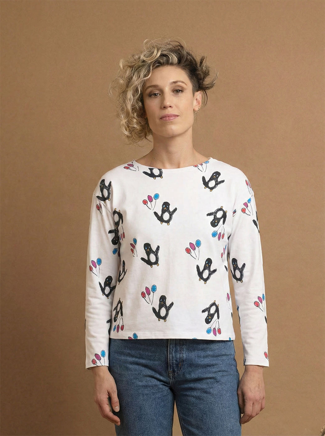 Una camiseta que no entiende de estaciones. Blanca, de manga larga y con un divertido estampado de pingüinos fiesteros, hecha en algodón orgánico GOTS. Ideal para looks cómodos y creativos y para cualquier celebración.