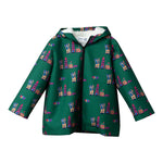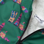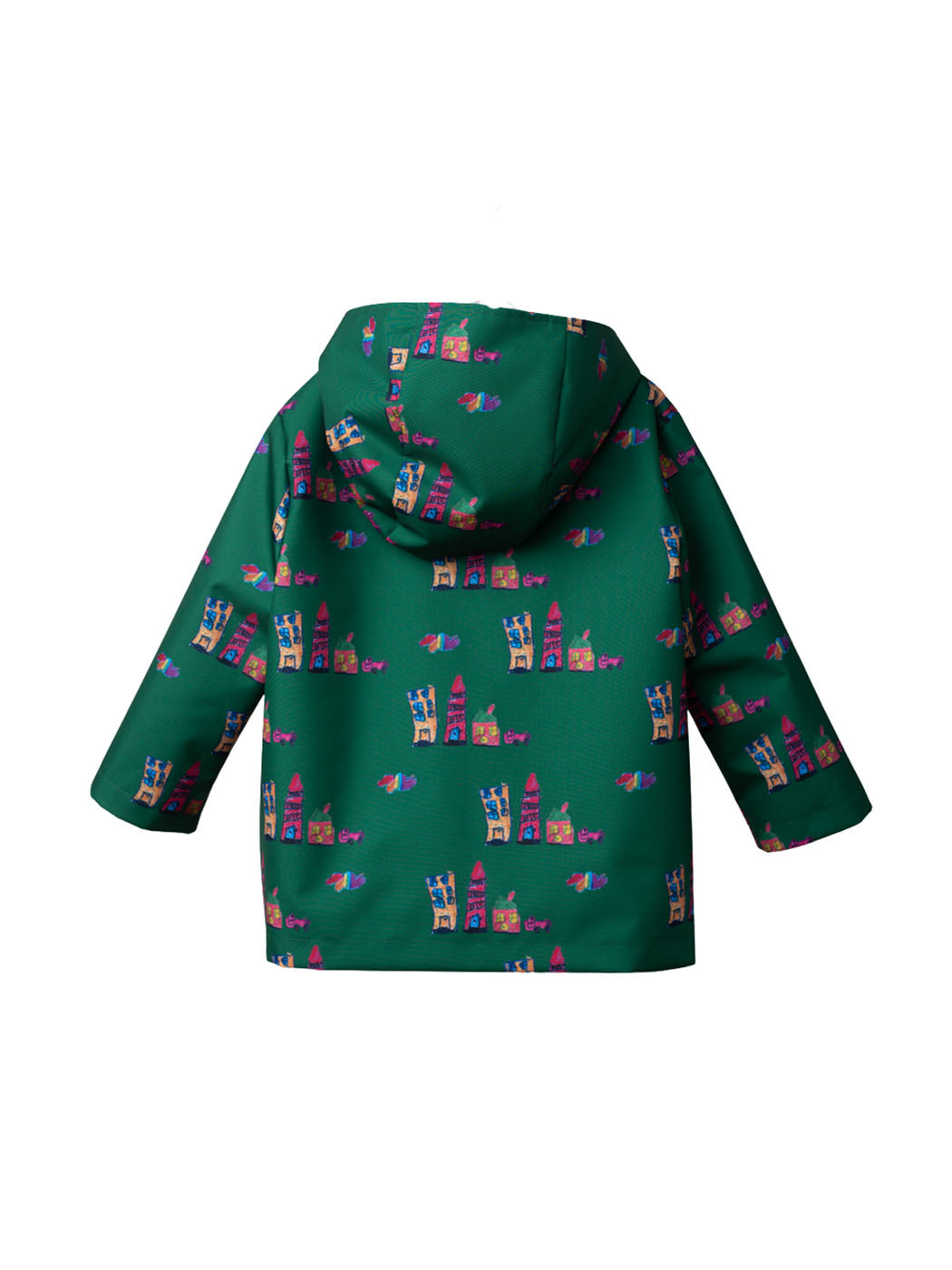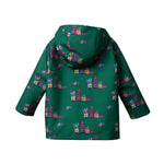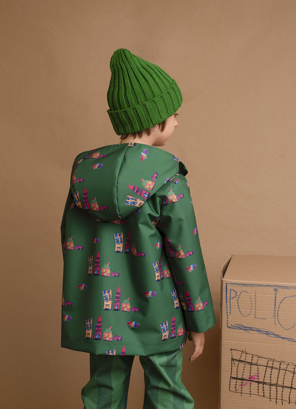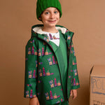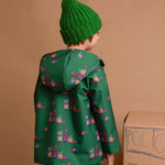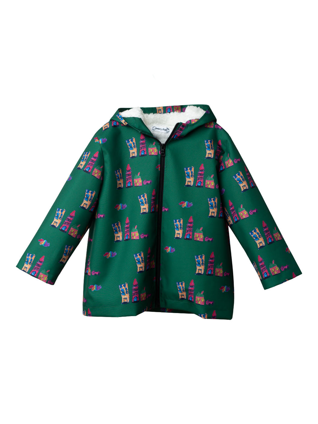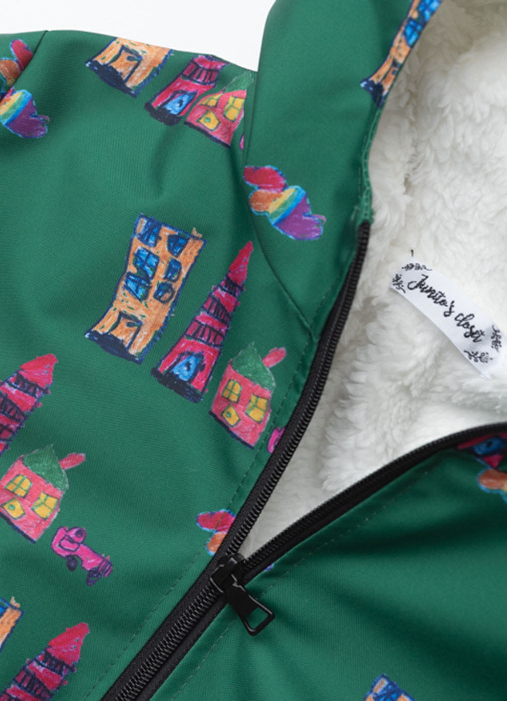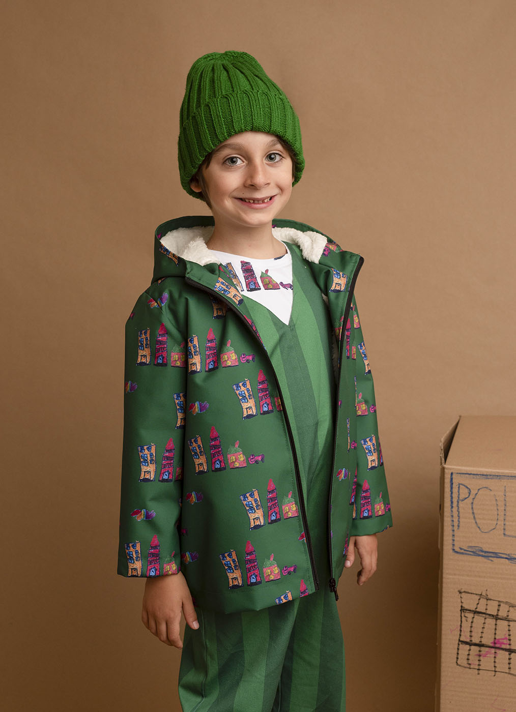 Este chubasquero verde con estampado de casitas está forrado de suave borreguito de algodón, para que tu peque esté cómodo incluso en los días de lluvia. Sostenible, funcional y con un diseño único que lo convierte en mucho más que un impermeable.
